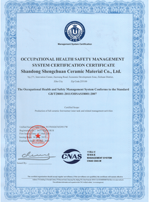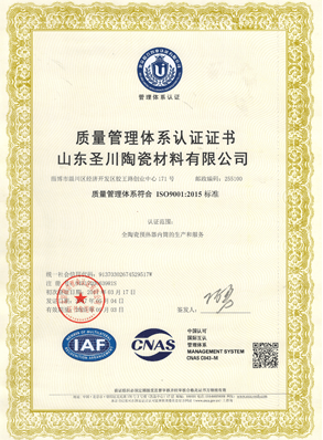 圣川陶瓷本着“追求完美品质,满足客户需求”的质量方针,公司不断完善质量保证体系、严格日常流程管理、坚持以高起点的投入和要求来保证圣川产品的稳定质量和优越性能。2011年初公司通过了ISO9001质量体系认证、ISO14001环境体系认证和ISO18001职业健康安全体系认证。